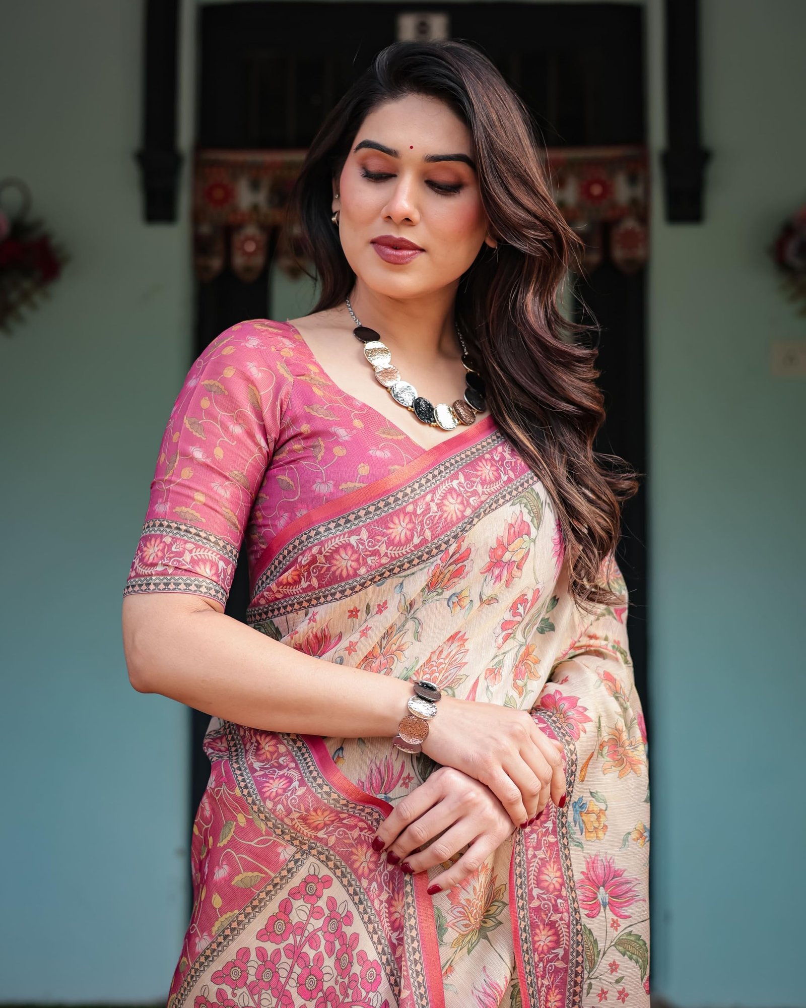 • Traditional and Trendy Design: A beautiful fusion saree, this traditional saree with a trendy floral print saree design is crafted from handloom cotton linen. Its vibrant yet elegant look makes it suitable for both casual saree outings and festive celebrations.