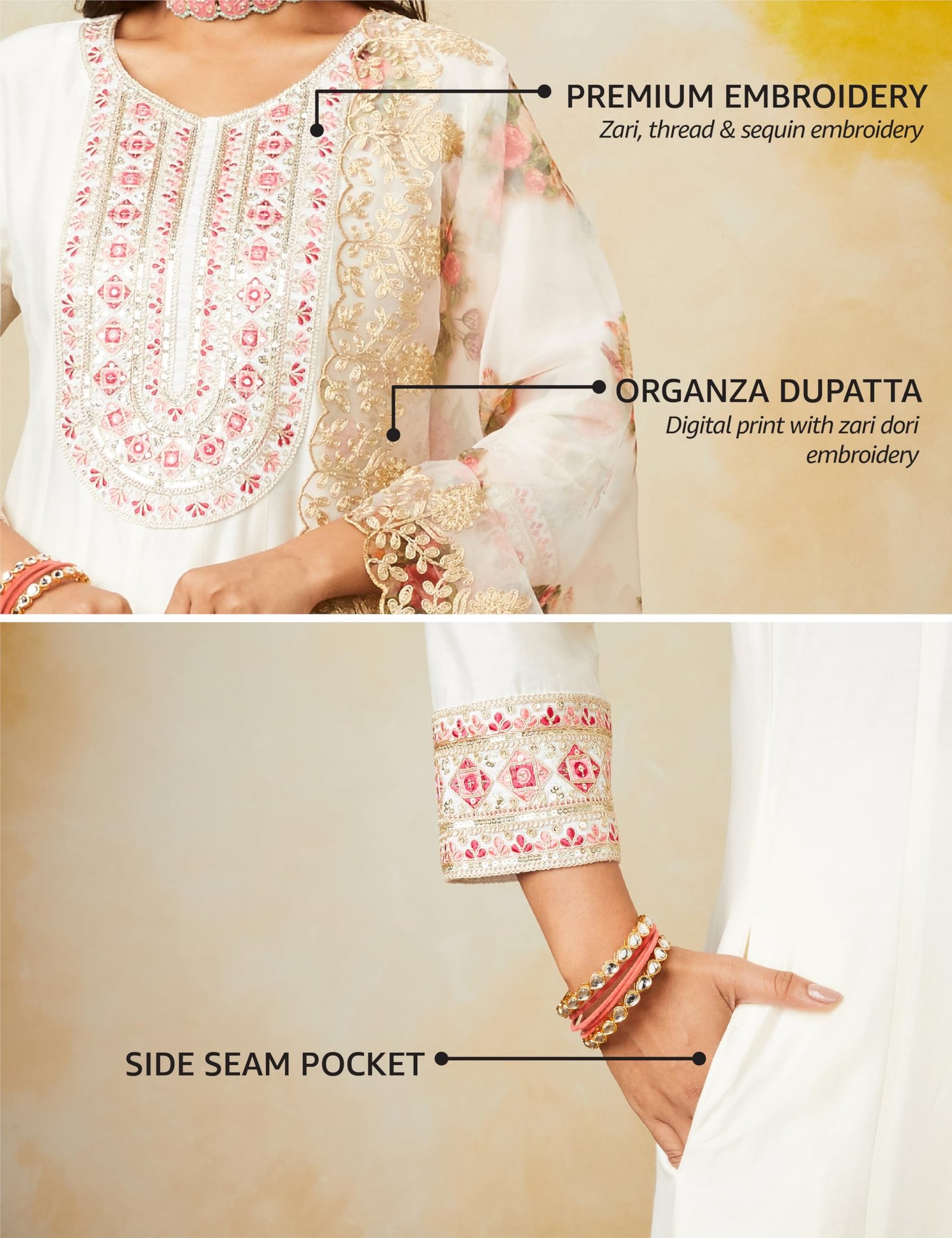 Amazon Brand – Myx Women’s Embroidered Anarkali Kurta Pant Set with Organza Dupatta | Viscose,Rayon | A-line fit (AW24-MYX-SKD-VN-03_Off-White_XL)
