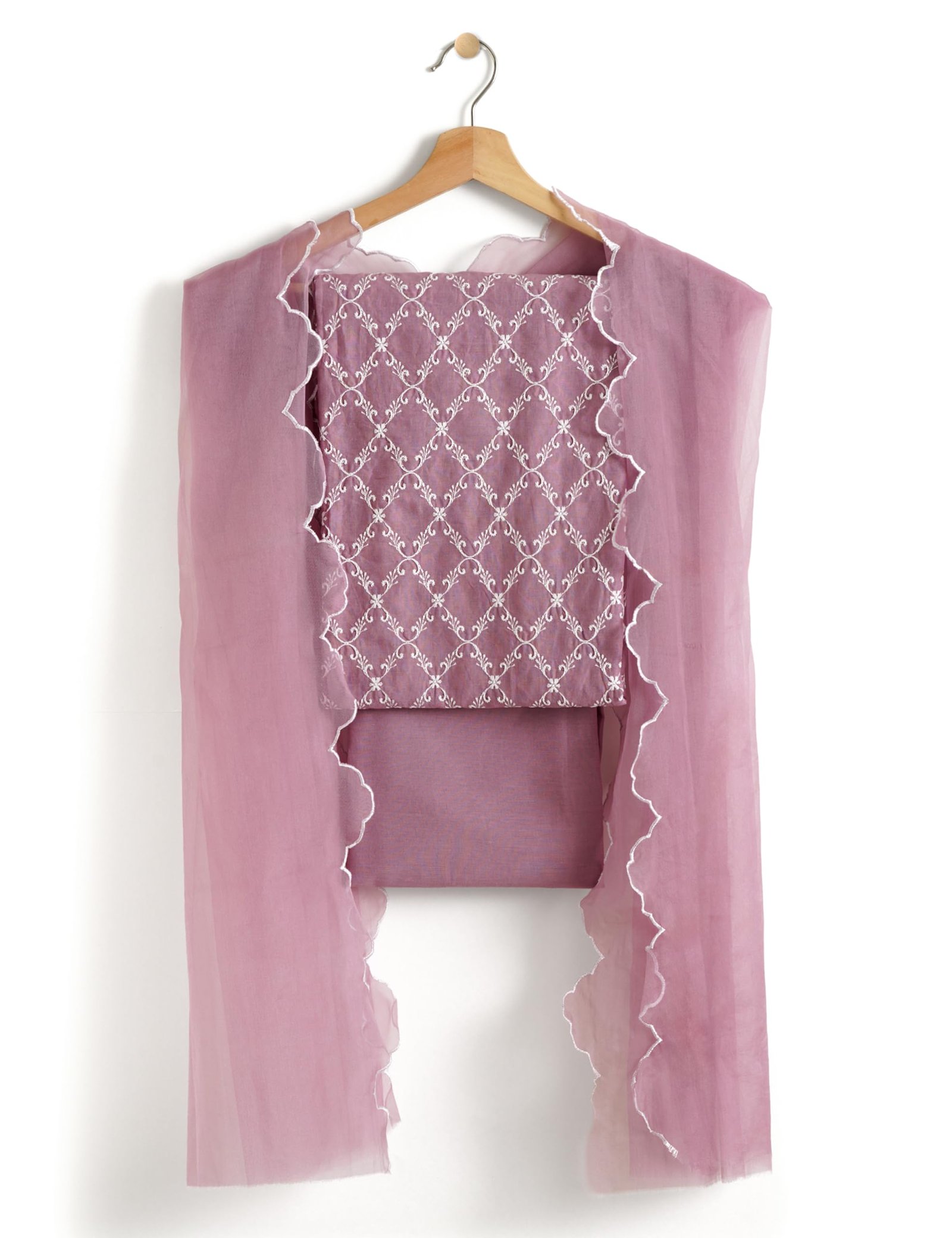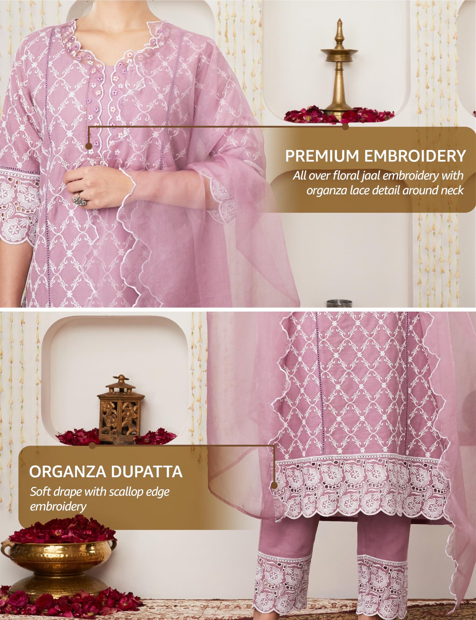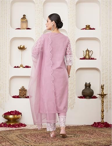 Amazon Brand – Myx Women’s Embroidered Cotton Kurta Pant Set with Organza Dupatta (SS25-MYX-SUR-KS-18_Mauve_XL)