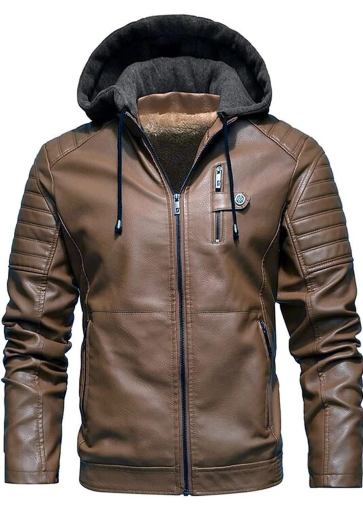 Blaq Ash Men’s Faux Leather Hooded Motorcycle Jacket (IN, Alpha, L, Light Brown)