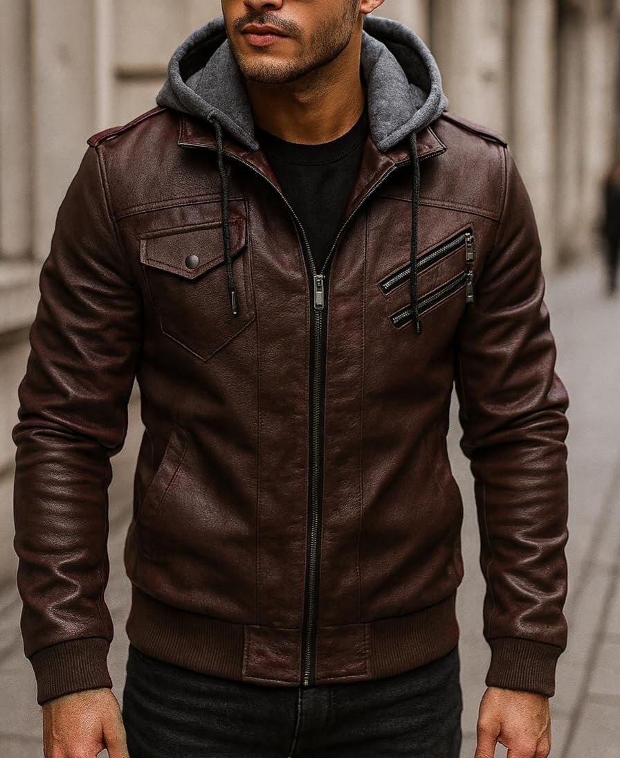 Blaq Ash Men’s Faux Leather Hooded Motorcycle Jacket, Zip-Up, with Pockets, Removable Hood (IN, Alpha, S, Brown)