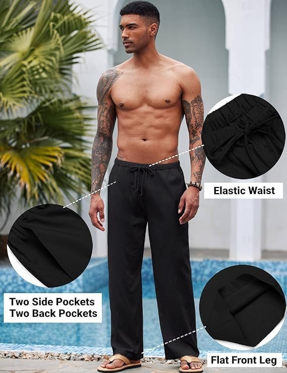 CB-COLEBROOK Mens Casual Linen Pants Elastic Waist Pants Drawstring Summer Beach Yoga Linen Trouser | Loose Fit Track Pants (in, Alpha, XL, Regular, Black)