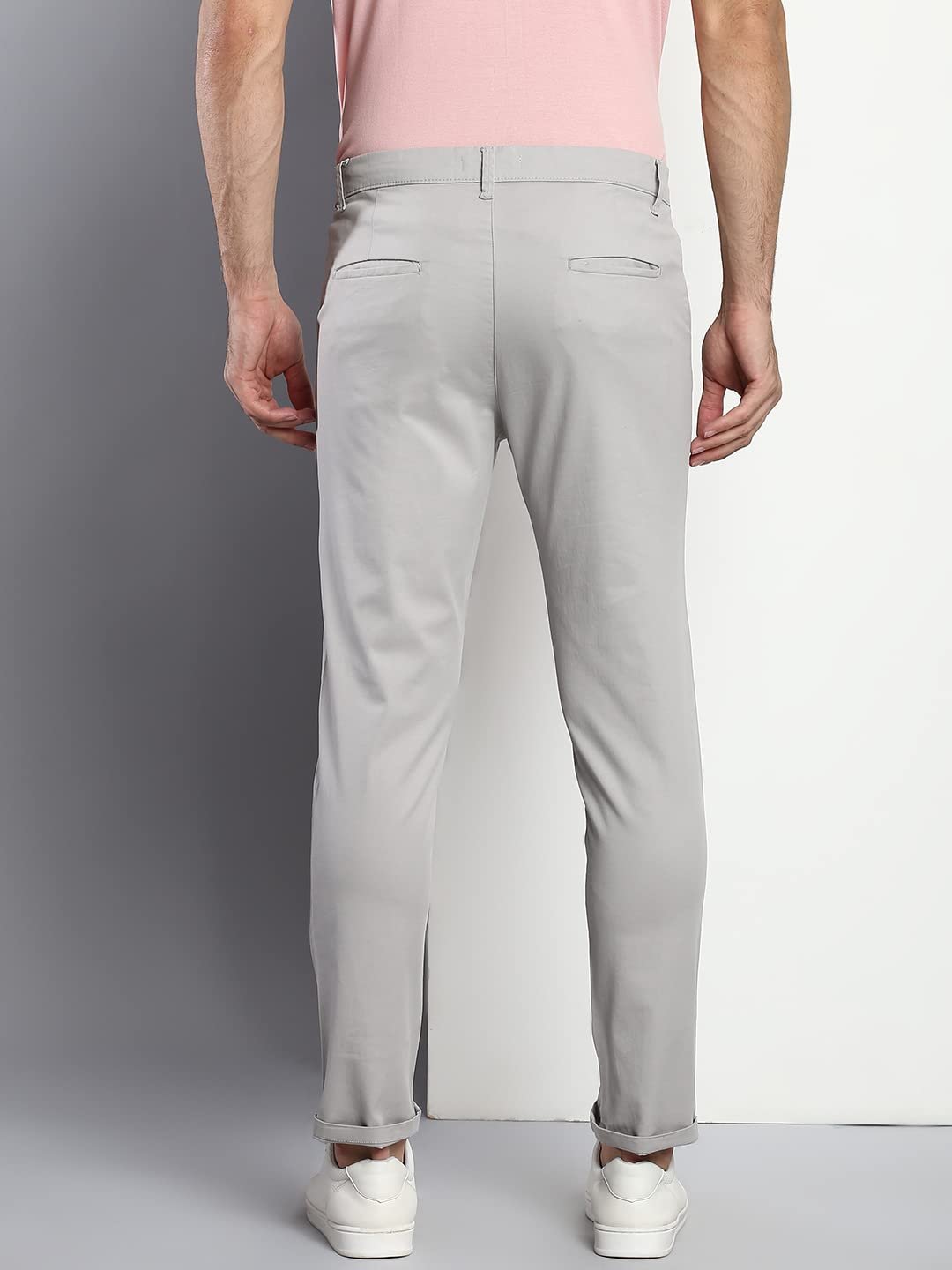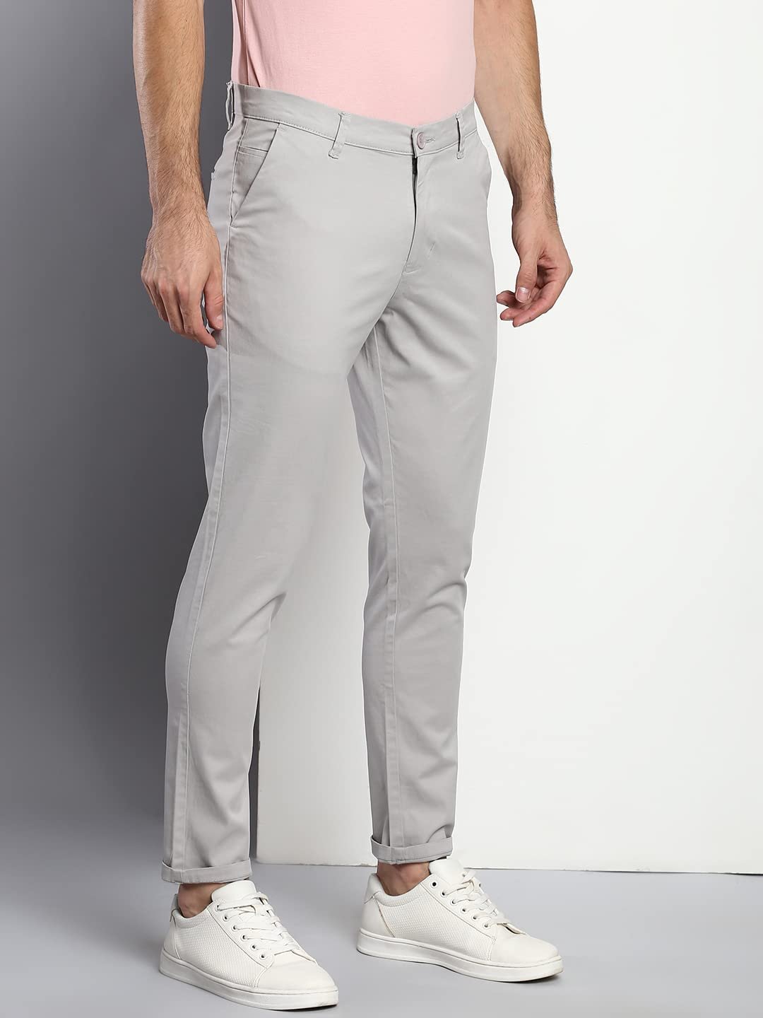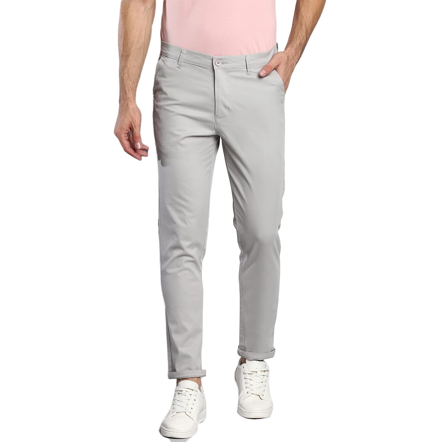 Dennis Lingo Men’s Cotton Solid Casual Trousers, Tapered Fit, Mid Rise, Stretchable Ankle Length Chino Trousers Light Grey