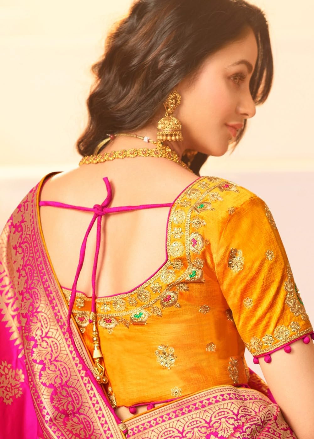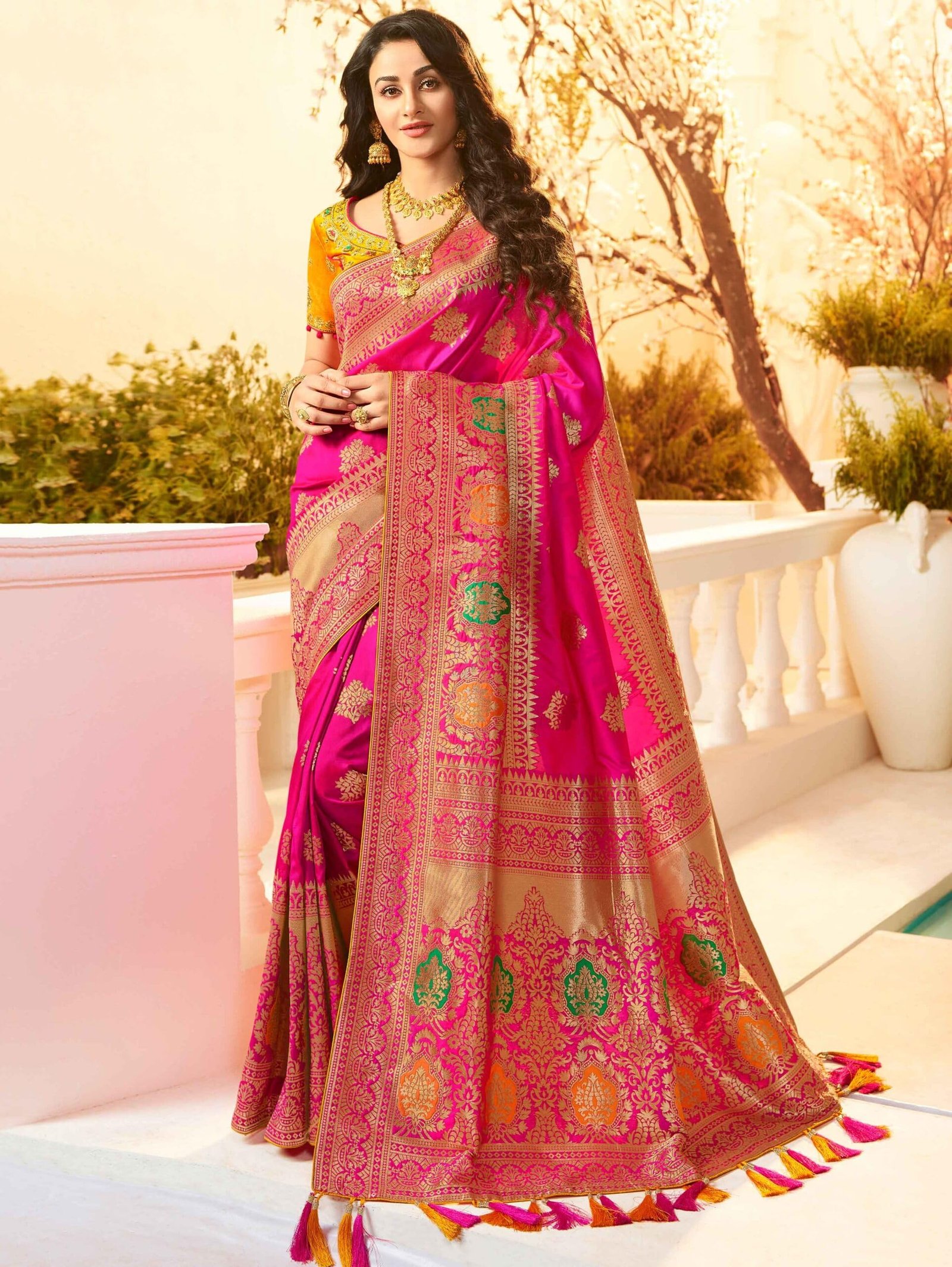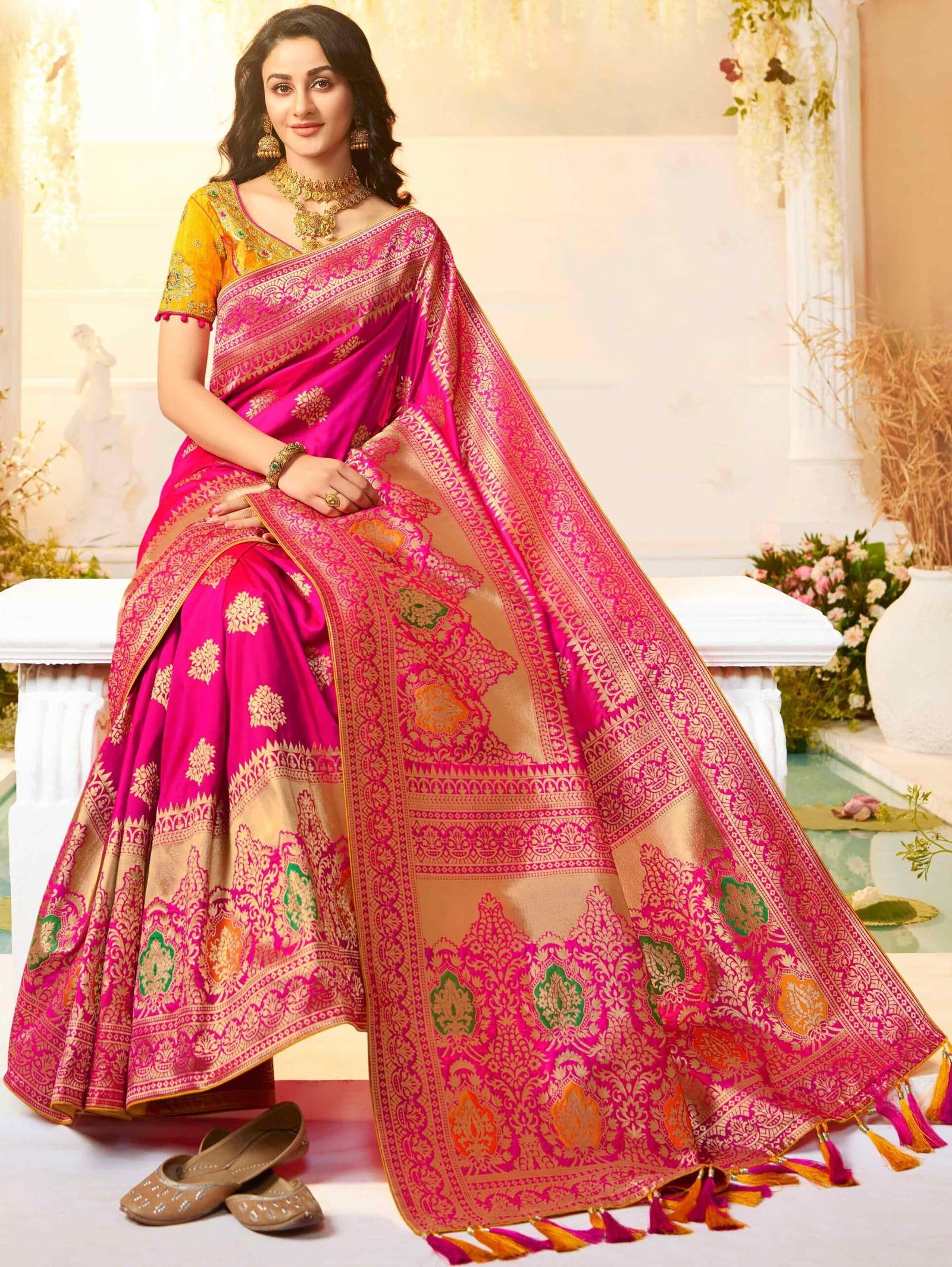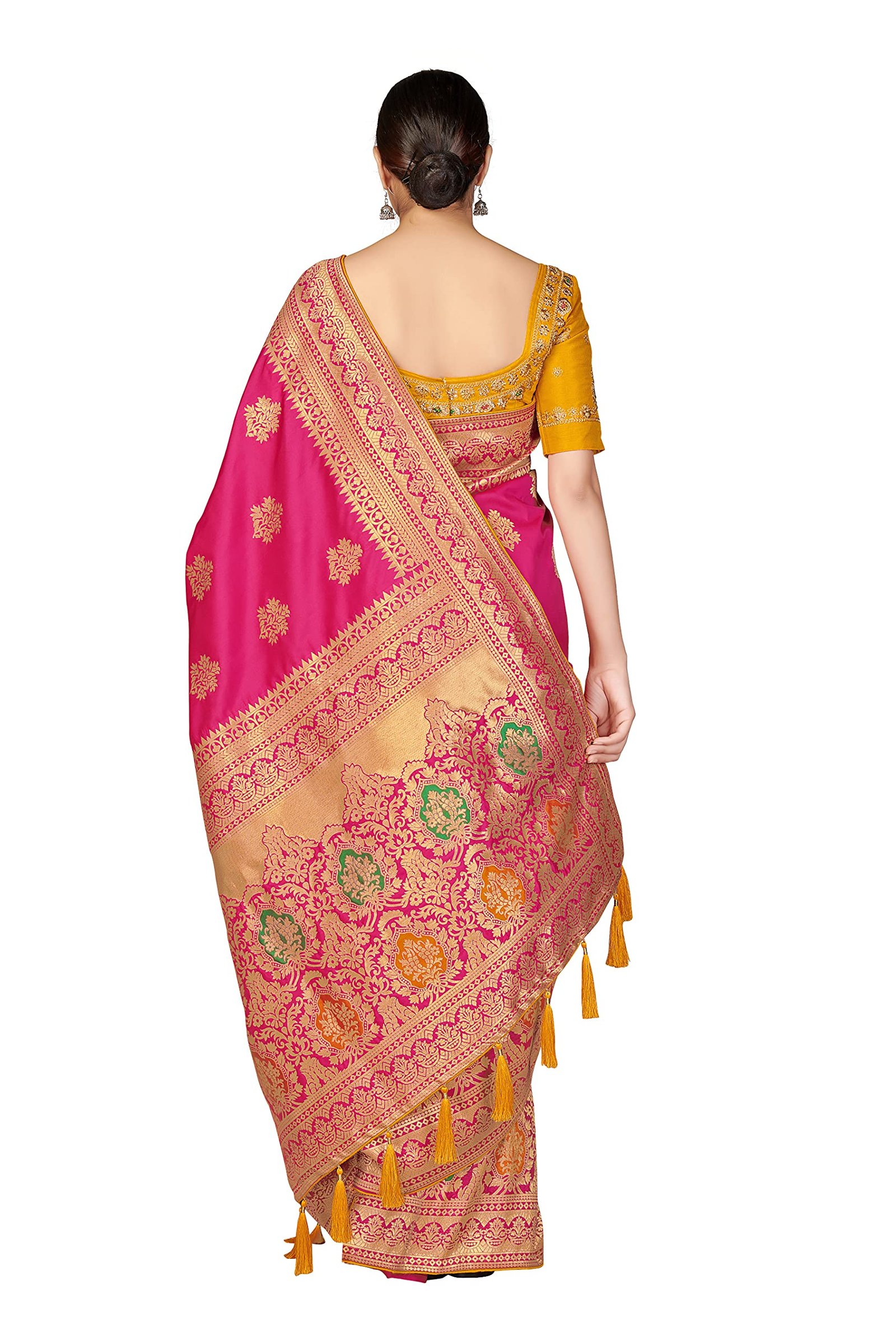 • Product Highlights : Fabric: Banarasi Silk Blend (Saree), Art Silk (Blouse) || Work: Zari Woven (Saree), Zari Embroidery (Blouse) || Colour: Saree –Rani Pink | Blouse – Yellow || This Banarasi silk Blend Saree with Subtle Zari Work.