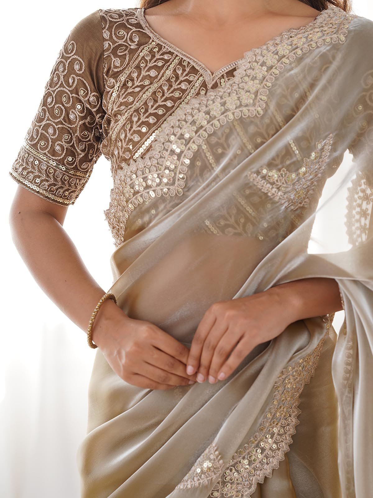 Satrani Women’s Tissue Silk Dyed Sequin Embroidery & Scollped Border Festive Saree with Unstitched Blouse Piece (4218S6634NA_Beige)