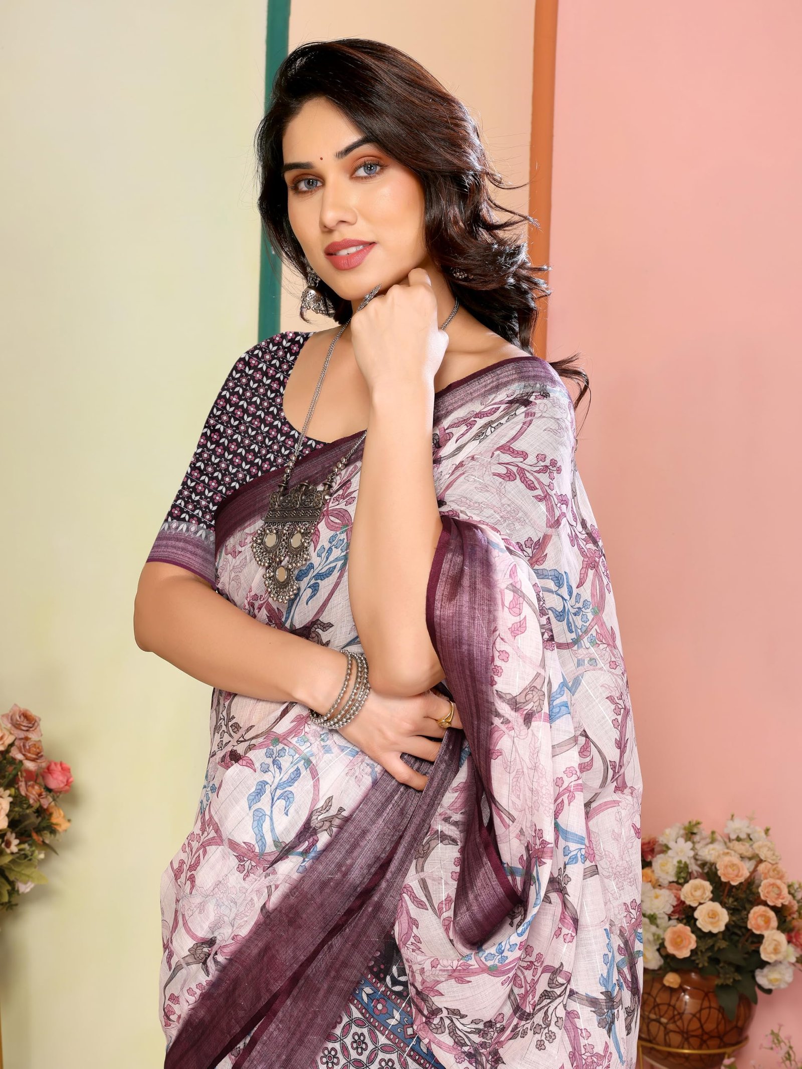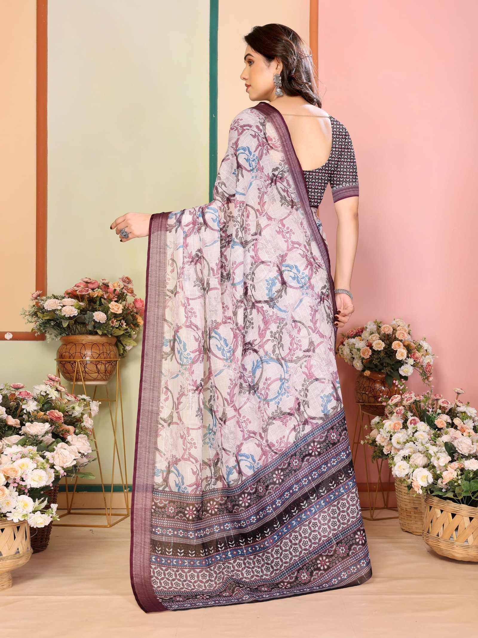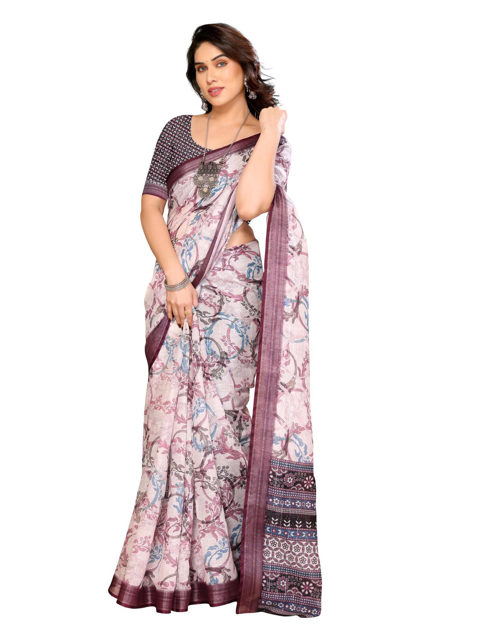 Sidhidata Women's Cotton Linen Blend Lining Digital Printed Saree With Unstitched Blouse Piece (LL Ring Wine_Wine_Free Size)