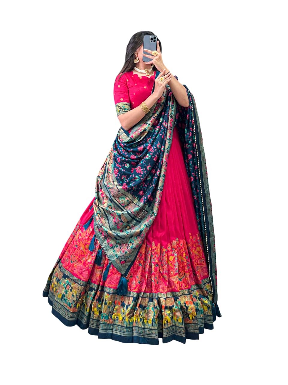 Be the first to review “Women’s Trending Designeer Tussar Silk Lehenga Choli Print with Foil Work With Unstitched Blouse Patola Print Adorned with Foil Work For Navrati || Wedding (MORANI RED)”
