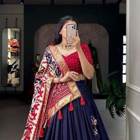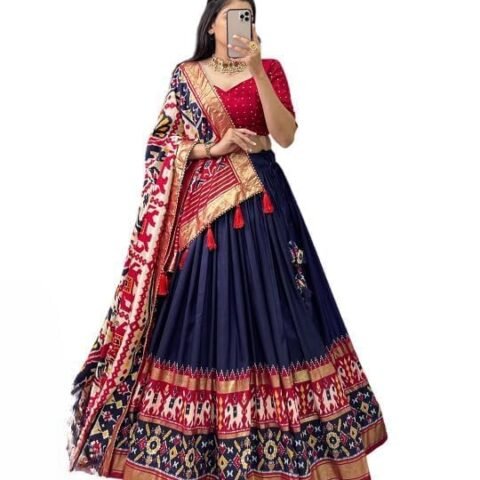 Women’s Trending Designeer Tussar Silk Lehenga Choli Print with Foil Work With Unstitched Blouse Patola Print Adorned with Foil Work For Navrati || Wedding (MIRROR NAVY BLUE)